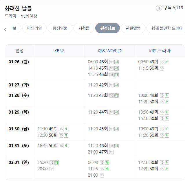 ✅ TIP: KBS Drama 채널은 평일 오전~심야 시간대 재방송이 많아 편성표 수시 확인이 필요해요!